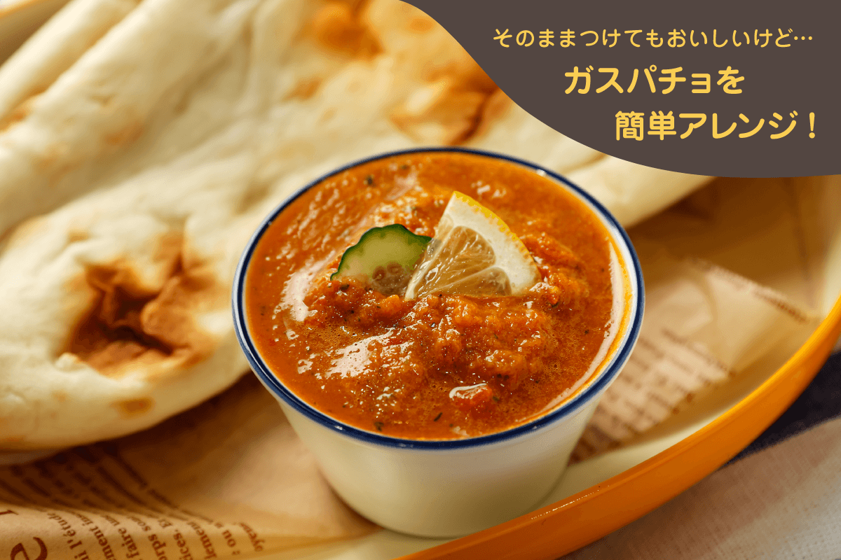 夏野菜の味と香りを存分に楽しめる冷製スープ「ガスパチョ」。ニンニクをしっかりときかせてスープにナンをディップしたら、止まらなくなること間違いなしです。 -