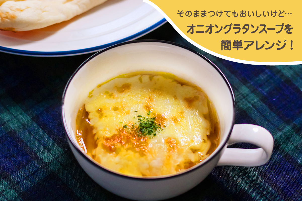 通常はスープの上にフランスパンをのせるオニオングラタンスープですが、今回はナンをのせて仕上げます。もちろんスープにナンをそのままディップしてもおいしくいただけますよ。 -